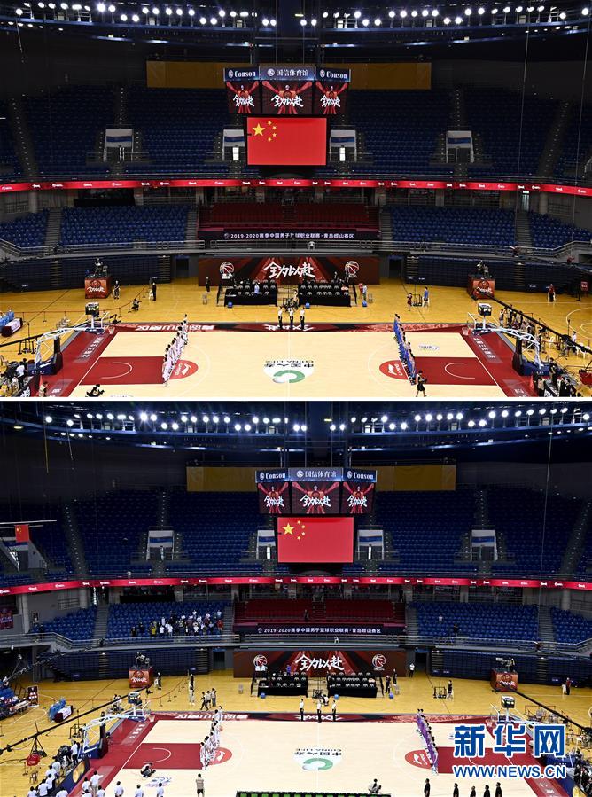 拼版照片的上圖為7月26日遼寧本鋼隊對陣四川五糧金樽隊的比賽現(xiàn)場;下圖為7月26日上海久事隊對陣山東西王隊的比賽現(xiàn)場,該場比賽首次恢復觀眾現(xiàn)場觀看比賽。當日,在山東青島舉行的2019-2020賽季中國男子籃球職業(yè)聯(lián)賽(CBA)復賽第二階段(嶗山賽區(qū))比賽中,醫(yī)護人員、教師、公安戰(zhàn)線人士通過官方購票平臺,完成包括核酸檢測在內(nèi)的相關流程后進場觀看了上海久事隊迎戰(zhàn)山東西王隊的比賽。觀賽期間,觀賽者須全程佩戴口罩,對號入座,嚴格保持間隔一米就座。退場時,觀眾須按照自后向前、先兩邊后中間的順序,保持“一米線”社交距離有序退場。新華社記者 郭緒雷 攝