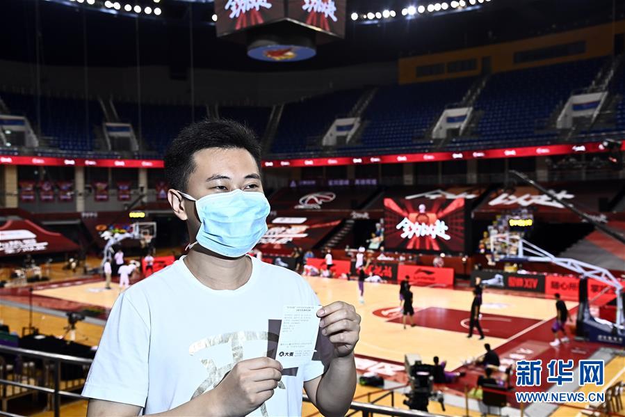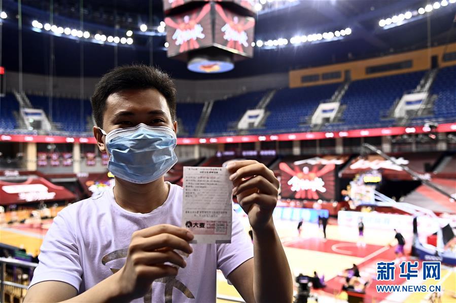 7月26日,在青島國信體育館,蘇柯帆展示著自己的紙質(zhì)球票。他成為CBA聯(lián)賽復賽允許觀眾現(xiàn)場觀賽后,首位進場的觀眾。當日,在山東青島舉行的2019-2020賽季中國男子籃球職業(yè)聯(lián)賽(CBA)復賽第二階段(嶗山賽區(qū))比賽中,醫(yī)護人員、教師、公安戰(zhàn)線人士通過官方購票平臺,完成包括核酸檢測在內(nèi)的相關流程后進場觀看了上海久事隊迎戰(zhàn)山東西王隊的比賽。觀賽期間,觀賽者須全程佩戴口罩,對號入座,嚴格保持間隔一米就座。退場時,觀眾須按照自后向前、先兩邊后中間的順序,保持“一米線”社交距離有序退場。新華社記者 郭緒雷 攝