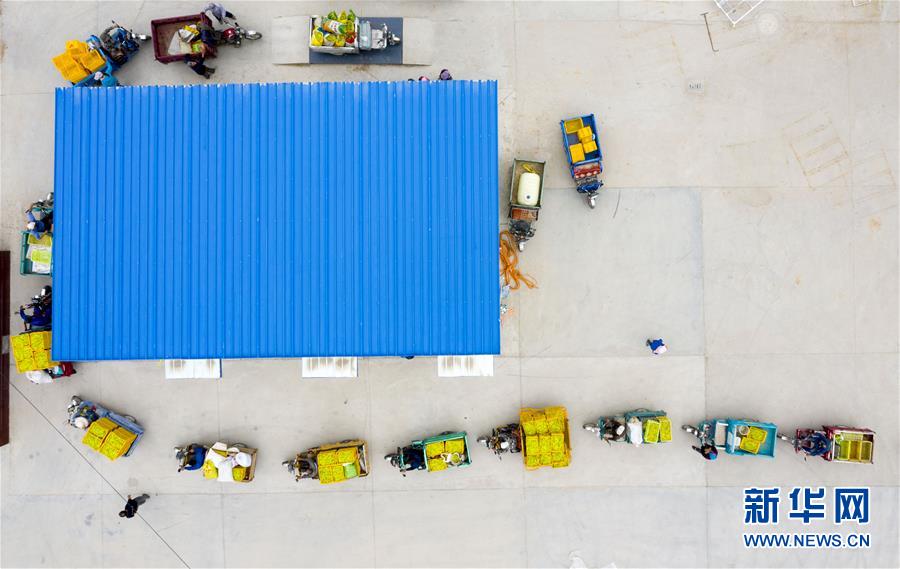 在寧夏紅寺堡區(qū)柳泉鄉(xiāng)柳泉村黃花菜晾曬場,村民排隊稱重黃花菜(7月11日攝,無人機照片)。新華社記者 楊植森 攝