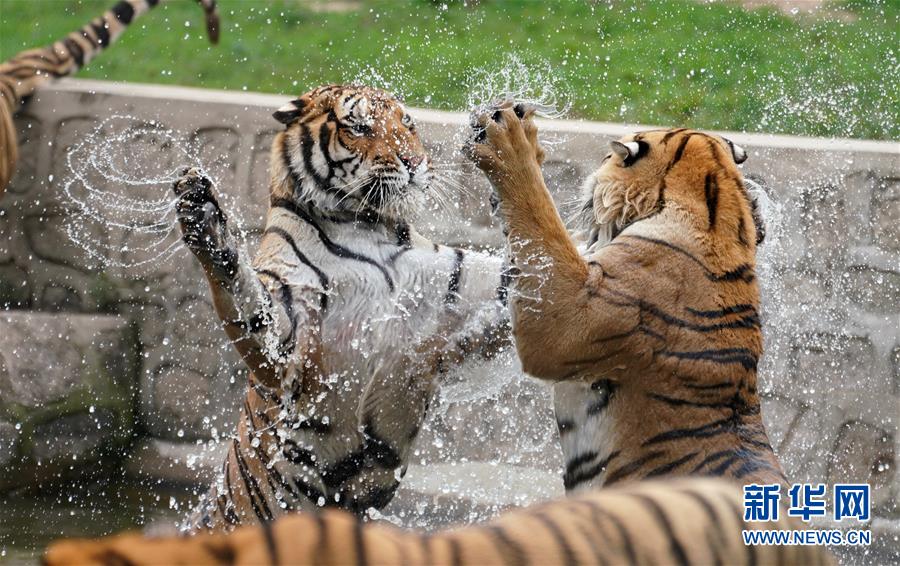 7月28日在橫道河子?xùn)|北虎林園拍攝的在水中納涼的東北虎。時值盛夏,位于黑龍江省海林市的橫道河子?xùn)|北虎林園的東北虎活動量減少,以不同方式消夏納涼。新華社記者王建威攝