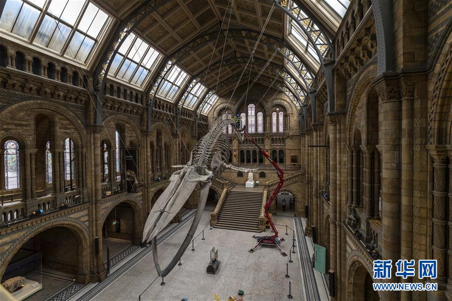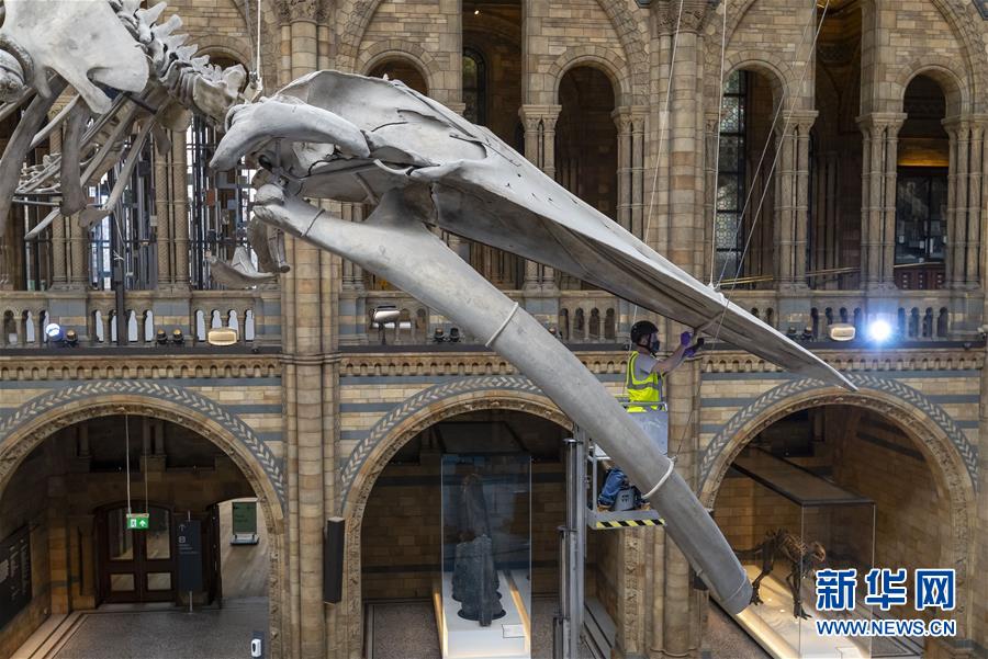 7月27日,工作人員在英國倫敦的自然歷史博物館大廳內清潔一具藍鯨骨架。受新冠疫情影響關閉數(shù)月的英國自然歷史博物館將于8月5日重新對外開放,目前館方正在為重新開放做最后準備。參觀者需要提前預約參觀時段、全程佩戴口罩且保持安全距離。新華社記者韓巖攝