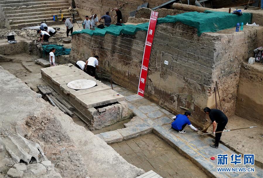 工作人員在河南省開封市州橋及附近汴河遺址進行清理發(fā)掘(7月27日攝)。新華社記者李安攝