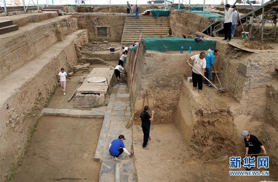 工作人員在河南省開封市州橋及附近汴河遺址進行清理發(fā)掘(7月27日攝)。新華社記者李安攝
