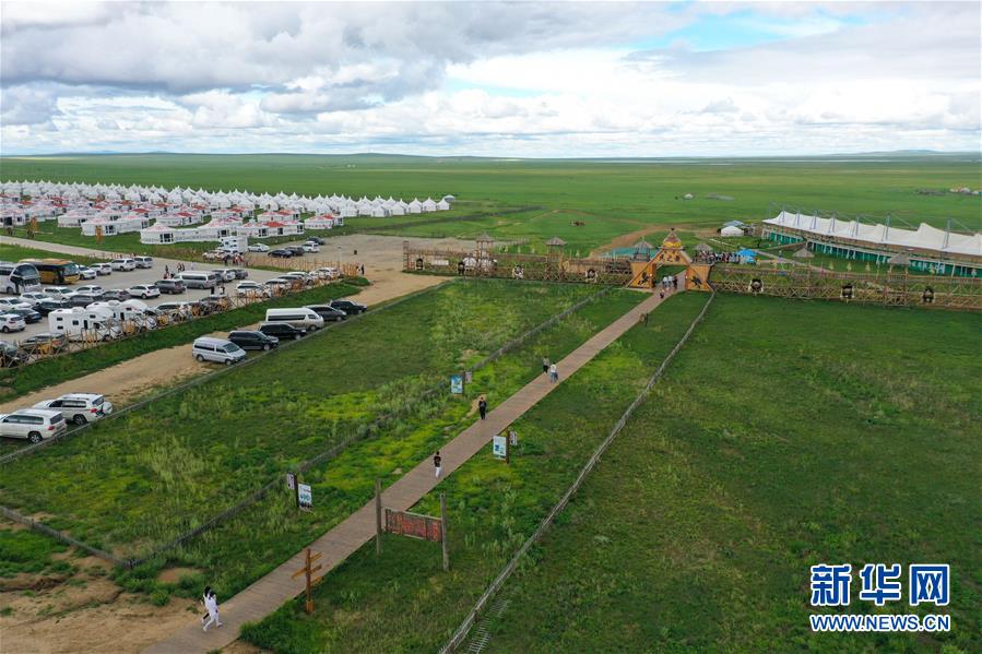 8月4日,游客在呼倫貝爾新巴爾虎左旗的民俗旅游度假景區(qū)游玩(無人機(jī)照片)。今年暑期,內(nèi)蒙古呼倫貝爾通過暫行周末2.5天彈性休假工作制度,發(fā)放旅游、餐飲消費(fèi)券,景區(qū)推出優(yōu)惠促銷活動(dòng)等措施,提振當(dāng)?shù)芈糜问袌?chǎng)。新華社記者徐欽攝
