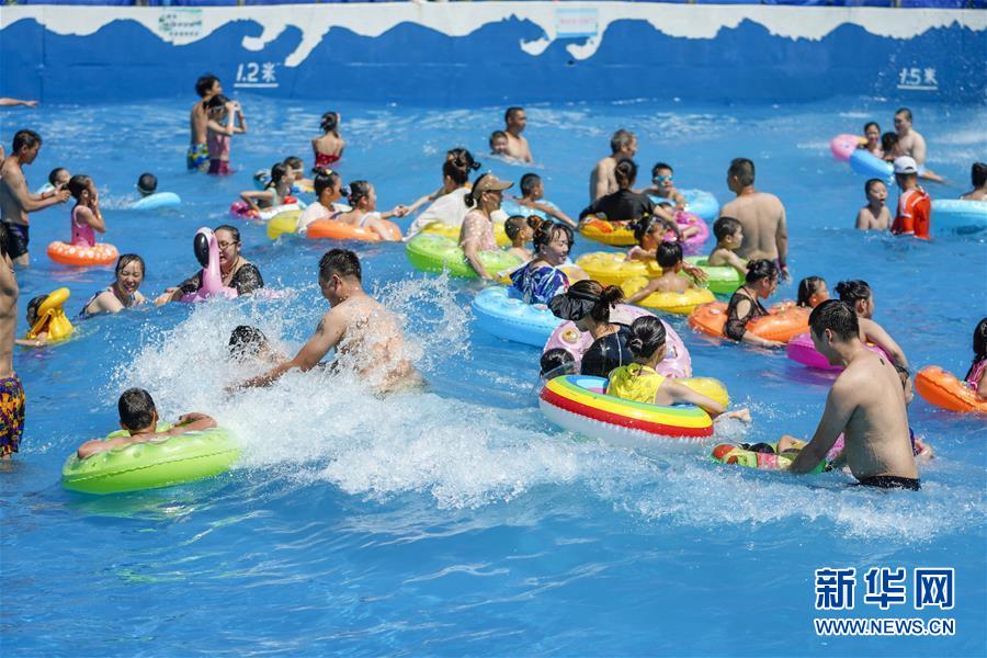 8月5日,重慶涪陵紅酒小鎮(zhèn)水上樂園內(nèi),市民在水中嬉戲。當日,重慶市氣象臺再次發(fā)布“高溫橙色預警信號”,重慶大部分海拔400米以下地區(qū)日最高氣溫將升至37℃以上,局地可達40℃以上。許多重慶市民涌進當?shù)氐乃蠘穲@和泳池,在水中享受夏季的清涼。新華社記者劉潺攝