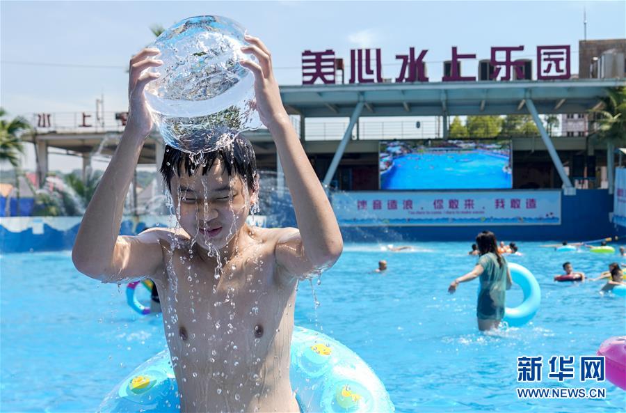 8月5日,重慶涪陵紅酒小鎮(zhèn)水上樂園內,一名游客用真冰做成的冰桶裝滿水,給自己澆水降溫。當日,重慶市氣象臺再次發(fā)布“高溫橙色預警信號”,重慶大部分海拔400米以下地區(qū)日最高氣溫將升至37℃以上,局地可達40℃以上。許多重慶市民涌進當?shù)氐乃蠘穲@和泳池,在水中享受夏季的清涼。新華社記者劉潺攝