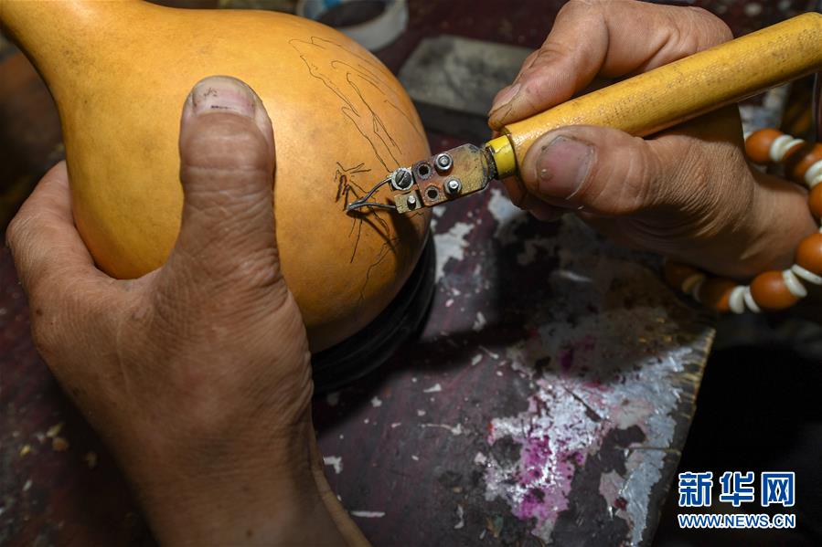8月5日,侯景偉在葫蘆上進行創(chuàng)作。今年55歲的吉林四平人侯景偉自幼與家人學(xué)習(xí)雕刻、烙畫藝術(shù)。經(jīng)過多年潛心研究,他將浮雕和烙畫工藝相結(jié)合,通過拋光、起稿、雕刻、烙燙、套色等十余道工藝,制作展現(xiàn)傳統(tǒng)文化、民俗故事的葫蘆工藝品。2020年,侯景偉被評為四平市非物質(zhì)文化遺產(chǎn)項目侯氏葫蘆雕刻烙畫代表性傳承人。他說:“希望有更多人加入到非遺傳承隊伍中,讓小葫蘆‘講’出更多民俗故事?!毙氯A社記者張楠攝