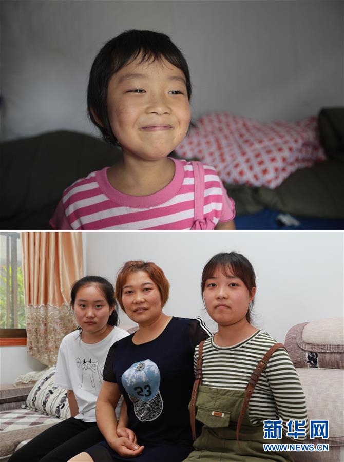 拼版照片:上圖為2010年8月20日,盼望開學的小雪梅在受災群眾安置點的帳篷內(新華社記者任正來攝);下圖為2020年7月14日,雪梅(右)和母親、妹妹在一起(新華社記者杜哲宇攝)。新華社發(fā)