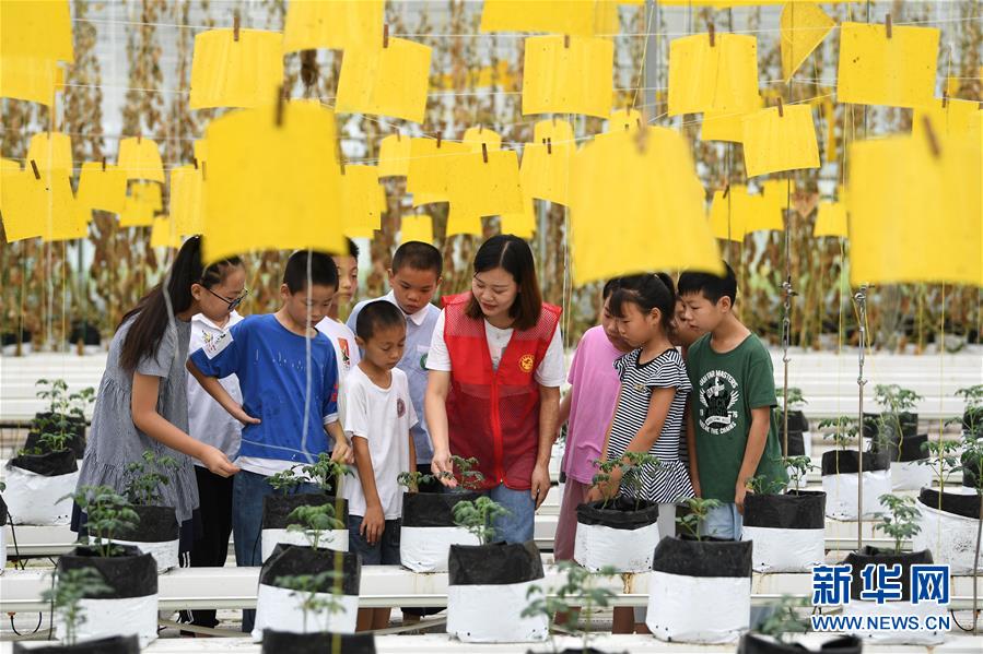 8月9日,在花崗鎮(zhèn)現(xiàn)代農(nóng)業(yè)示范區(qū)一家蔬菜種植企業(yè)內(nèi),志愿者向小朋友介紹蔬菜種植模式。當(dāng)日,安徽省肥西縣花崗鎮(zhèn)開展暑期“親近自然體驗(yàn)田園”活動(dòng),邀請(qǐng)轄區(qū)兒童參觀花崗鎮(zhèn)現(xiàn)代農(nóng)業(yè)示范區(qū),感受現(xiàn)代農(nóng)業(yè)的魅力。新華社記者劉軍喜攝。