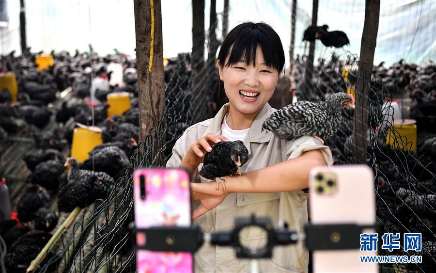 陜西商洛市丹鳳縣寺坪鎮(zhèn)寺坪村的網(wǎng)絡(luò)主播李萌在直播介紹自家養(yǎng)的蘆花雞(7月20日攝)。陜西丹鳳縣位于秦嶺東段南麓,依山傍水、農(nóng)特產(chǎn)品豐富。近年來(lái),隨著網(wǎng)絡(luò)銷(xiāo)售模式的興起,當(dāng)?shù)胤e極培育壯大“本土網(wǎng)紅”隊(duì)伍,通過(guò)網(wǎng)絡(luò)直播、線上銷(xiāo)售、線下配送等形式,助力秦嶺山區(qū)優(yōu)質(zhì)農(nóng)產(chǎn)品走出大山,帶動(dòng)百姓增收致富。新華社記者劉瀟攝。