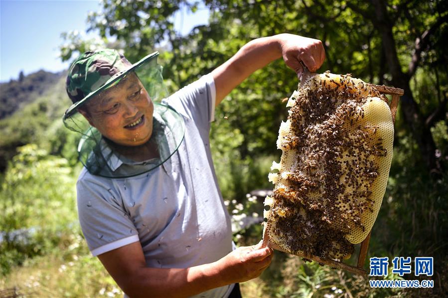 陜西漢中市留壩縣火燒店鎮(zhèn)天星亮村村民在展示扶貧社養(yǎng)殖的蜜蜂(7月2日攝)。秦嶺生態(tài)資源豐富,具有得天獨(dú)厚的蜜蜂養(yǎng)殖條件,但多年來(lái)山區(qū)農(nóng)戶自產(chǎn)自銷(xiāo)的模式收益甚少。近年來(lái),多地采取“農(nóng)戶+合作社”模式,讓山區(qū)群眾養(yǎng)蜂增收有了保障。新華社記者劉瀟攝。