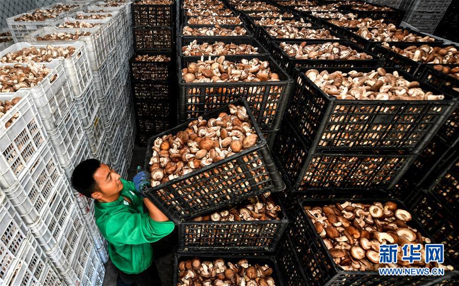 陜西漢中市留壩縣武官驛鎮(zhèn)留香益品商貿(mào)公司的員工在擺放冷庫(kù)里的香菇(7月2日攝)。陜西留壩縣是陜西西南部的特色農(nóng)業(yè)產(chǎn)業(yè)縣,近年來(lái)在推進(jìn)產(chǎn)業(yè)富民的過(guò)程中,開(kāi)辟出一條“政府+龍頭企業(yè)+扶貧社+農(nóng)戶”的訂單產(chǎn)業(yè)發(fā)展道路,把農(nóng)戶綁在產(chǎn)業(yè)鏈上,持續(xù)帶動(dòng)農(nóng)業(yè)增效、農(nóng)民增收。新華社記者劉瀟攝。