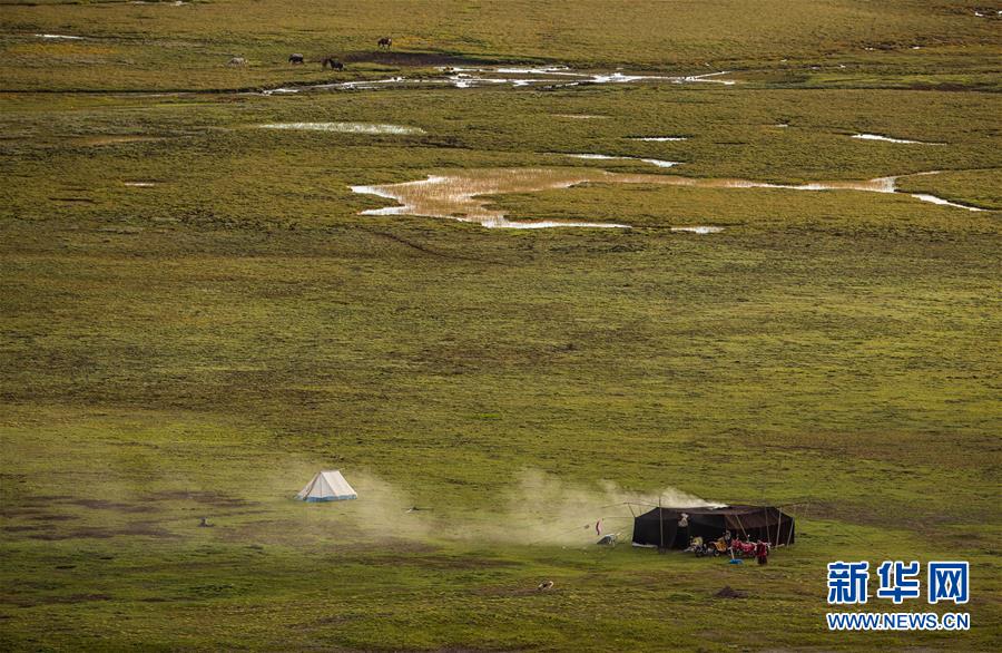 一群牦牛在泥拉壩濕地里徜徉覓食(8月9日攝)。新華社記者江宏景攝。