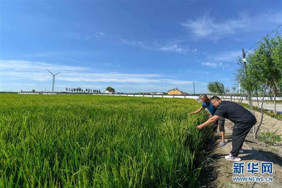 8月12日,在鎮(zhèn)賚縣黑魚泡鎮(zhèn)岔臺村,村民曲海波(左)和駐村第一書記姜宏寅在查看水稻長勢。新華社記者 張楠 攝