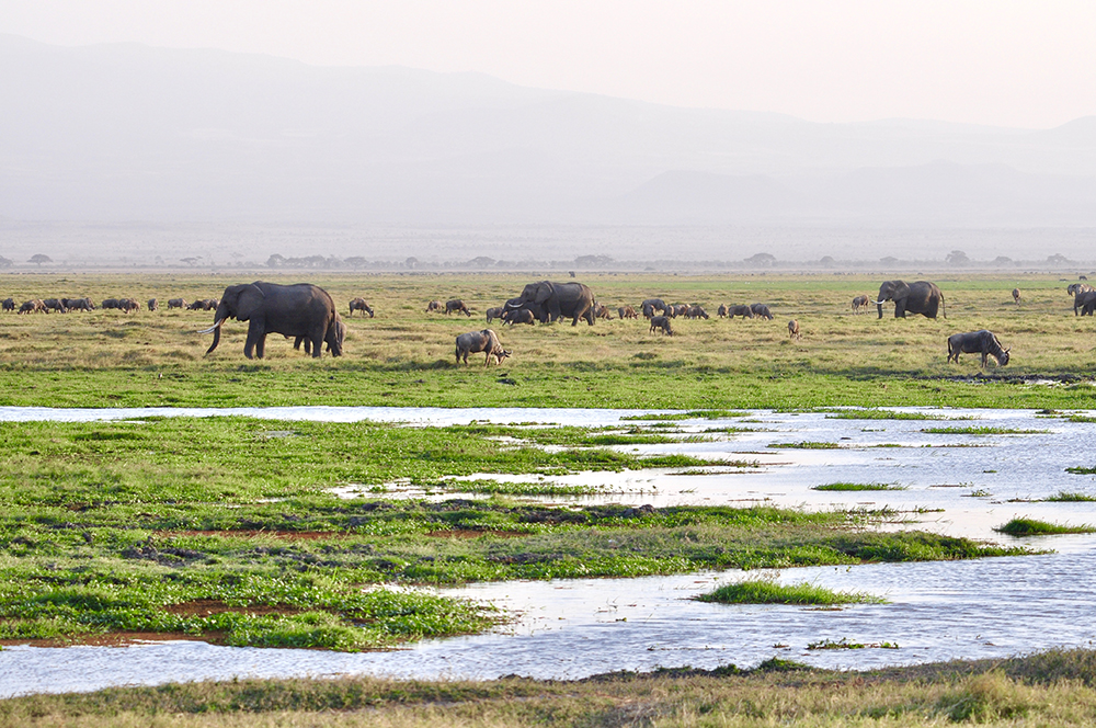 肯尼亞東南部,與坦桑尼亞接壤的安博賽利國家公園,距內(nèi)羅畢240公里,因水草豐美而成為野生非洲大象的樂園。