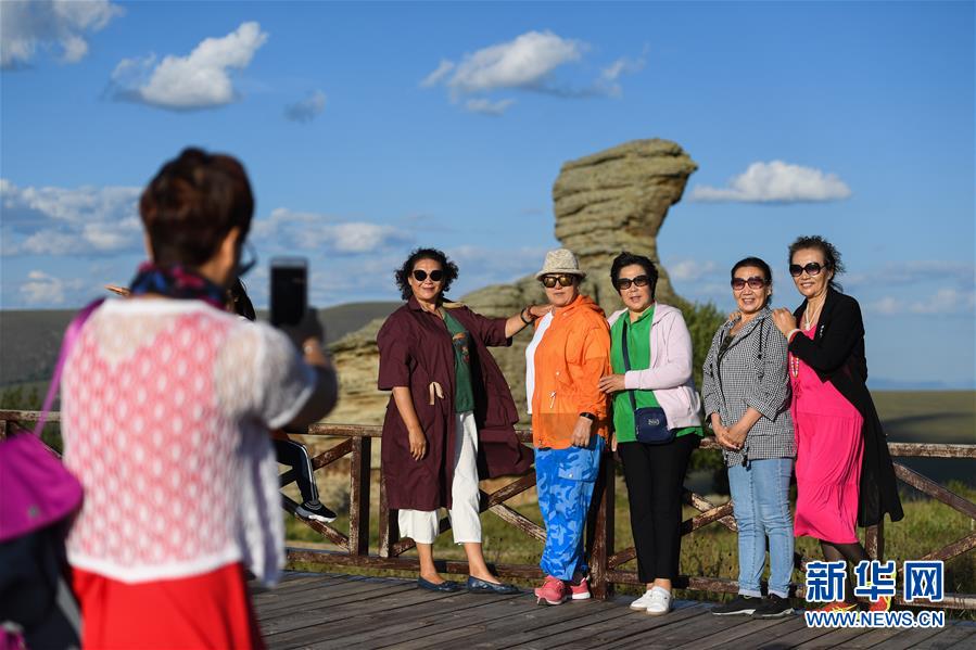 游客在克什克騰石陣景區(qū)拍照留影(8月11日攝)。克什克騰旗位于內蒙古自治區(qū)赤峰市西北部,境內的湖泊、河流、草原、森林等自然景觀,讓人們流連忘返。新華社記者劉磊攝