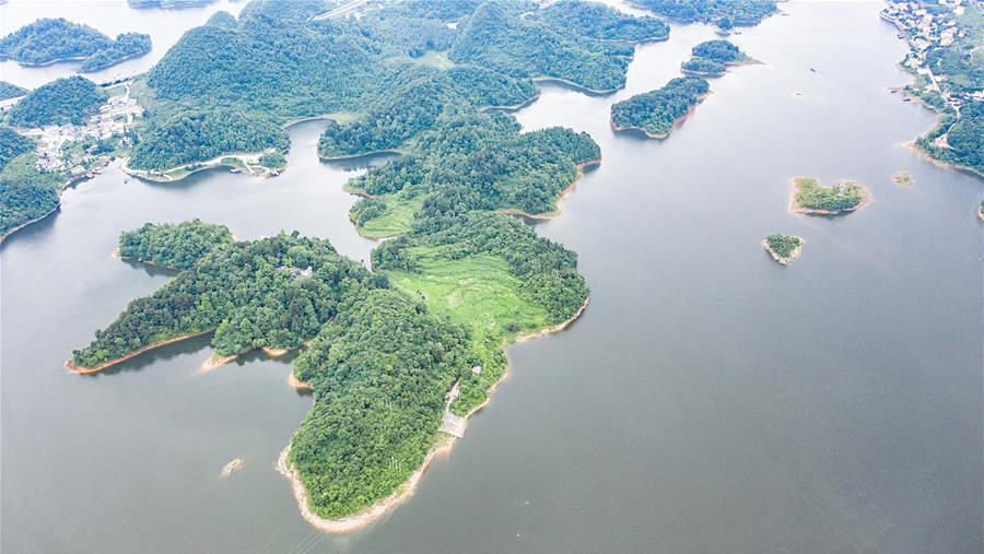 夏至?xí)r節(jié),貴州省清鎮(zhèn)市紅楓湖景區(qū)草木蒼翠,秀麗的湖光山色吸引不少游客前來(lái)游玩。