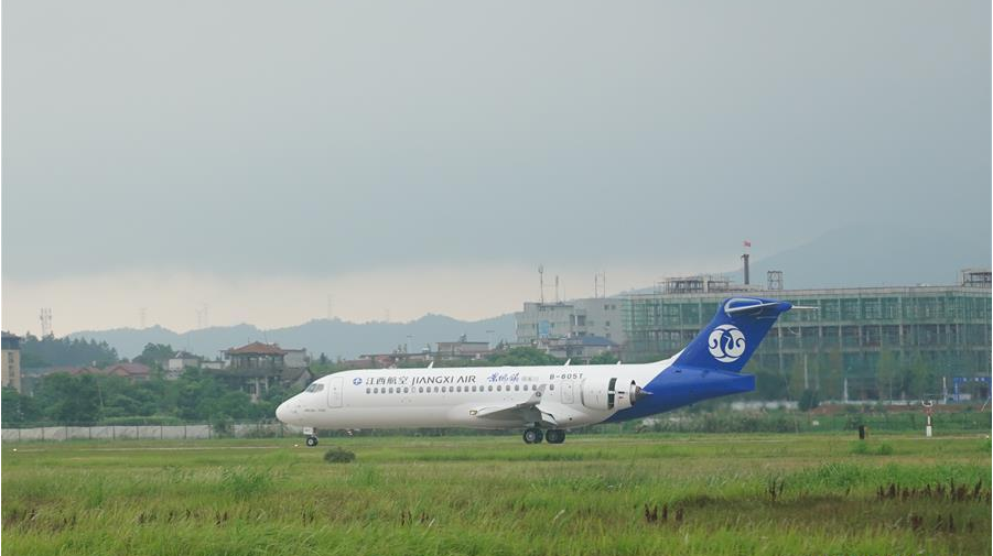 6月10日,“景德鎮(zhèn)”號ARJ21客機(jī)降落在江西景德鎮(zhèn)羅家機(jī)場。