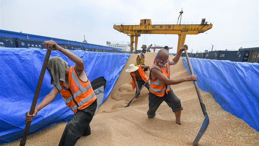6月10日,在成都糧食集團(tuán)青白江國家糧食儲備庫,工人在運(yùn)糧火車的貨廂內(nèi)卸貨。