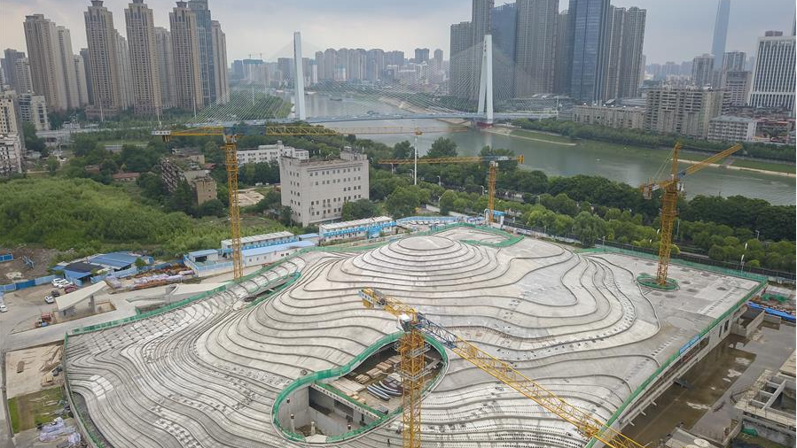 這是6月10日拍攝的已經(jīng)完成主體結(jié)構(gòu)和現(xiàn)場屋面施工的武漢琴臺美術(shù)館(無人機(jī)照片)。