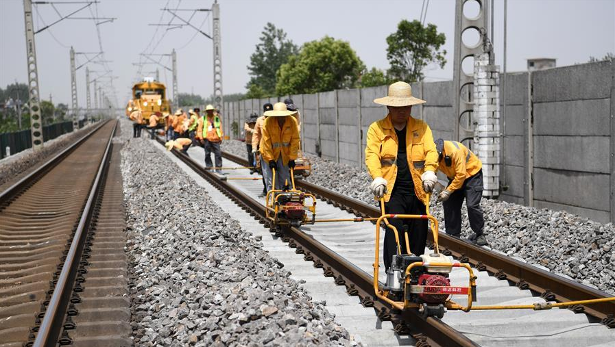 6月3日,施工人員在京九鐵路線上進(jìn)行更換水泥枕施工。