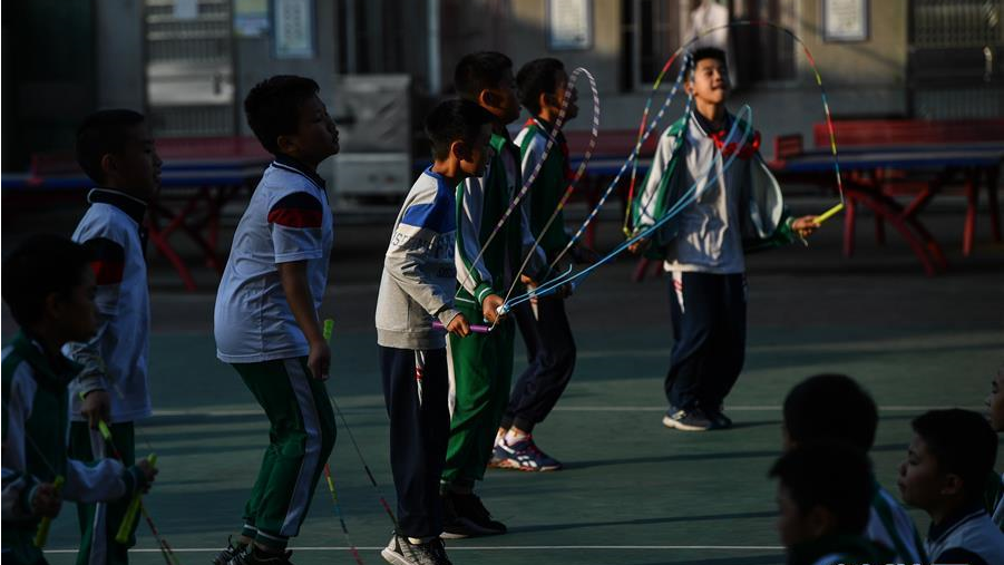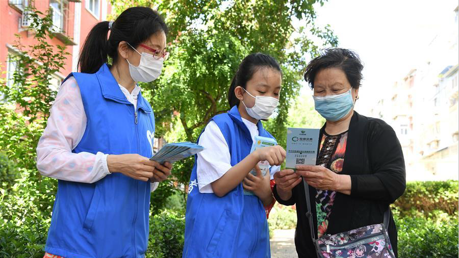 在北京市海淀區(qū)中關(guān)村街道青云北社區(qū),胡欣然(中)與社區(qū)工作人員(左)一起為社區(qū)居民發(fā)放垃圾分類宣傳手冊。