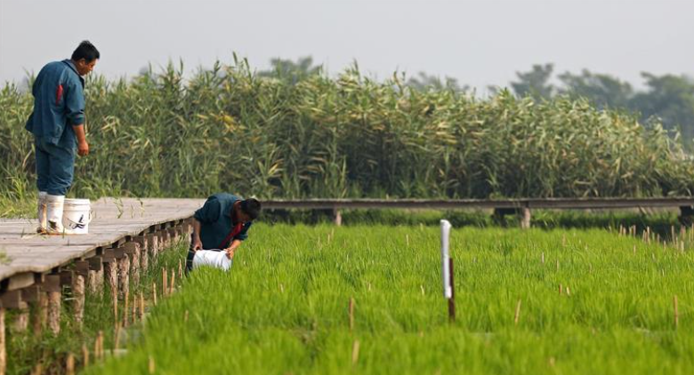 ?盤錦市胡家鎮(zhèn)農(nóng)民張海濤在自家稻田里查看水稻和稻田里河蟹的長勢(無人機(jī)照片,7月21日攝)。