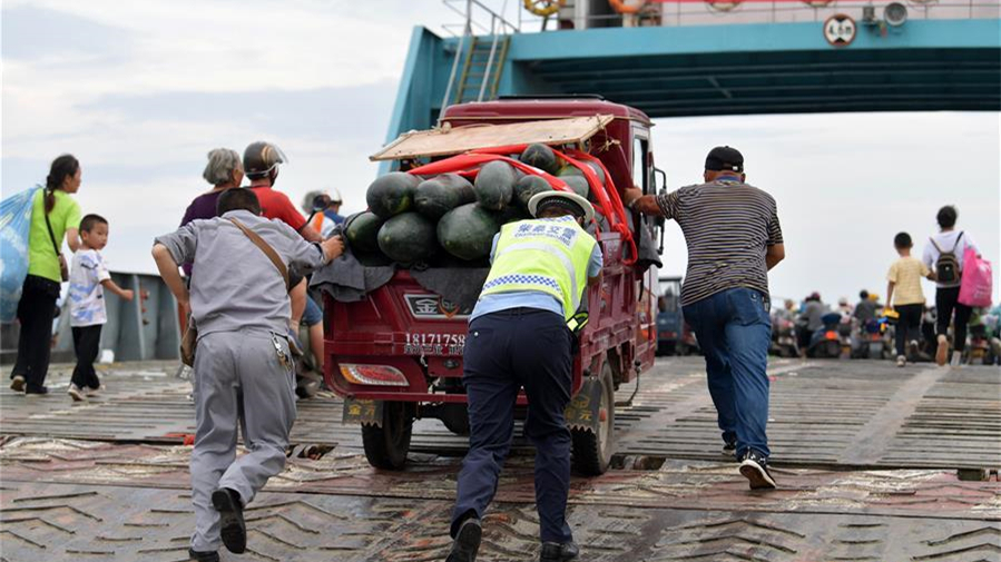 在江西省九江市柴桑區(qū)江新洲的渡口,交警協(xié)助居民有序轉移。