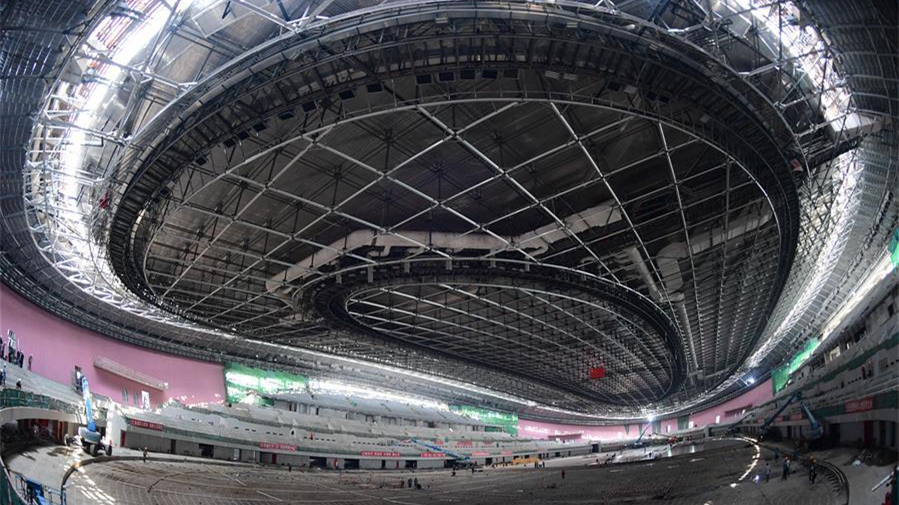 7月22日,工人在國家速滑館內施工。