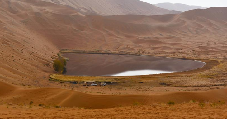 巴丹吉林沙漠位于內(nèi)蒙古西部阿拉善盟,是中國(guó)第三大沙漠,沙丘起伏的曲線陡變成高聳的沙山,碧藍(lán)的湖泊散落在沙海間。