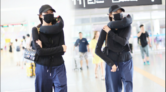 關(guān)曉彤淡定抱臂行走,脖子上掛U型枕毫無偶像包袱。
