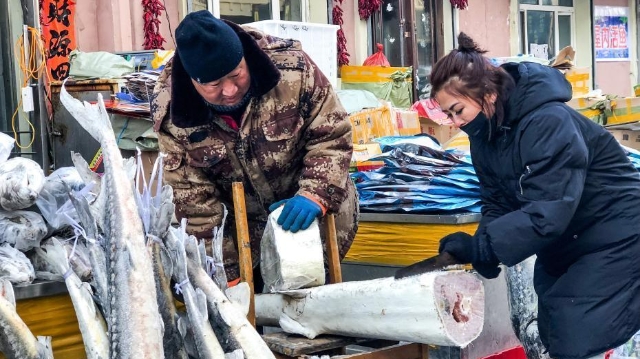 寒冬臘月是黑龍江撫遠的凍魚銷售旺季。讓人大開眼界的是,一二百斤大魚得鋸開了賣;最讓魚販子開心的是,最多一天進賬5萬元。
