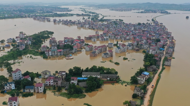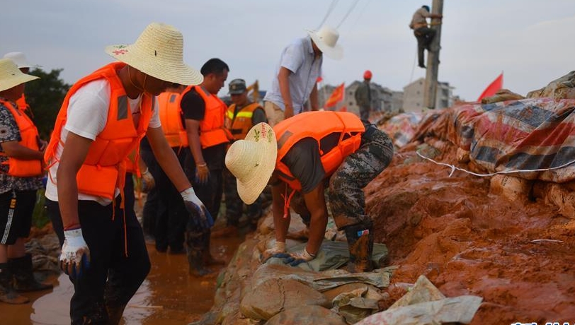 在江西鄱陽縣昌江圩,武警江西總隊機動支隊的工作人員和當?shù)卮迕褚黄鹂干炒庸疼椎?