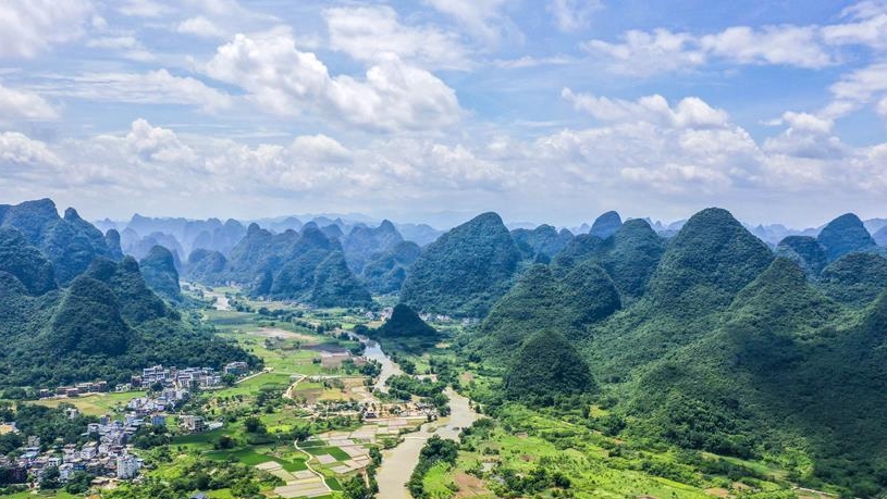 時(shí)值夏日,廣西桂林市陽(yáng)朔縣景色宜人,青山綠草、藍(lán)天白云構(gòu)成一幅幅美麗的山水畫卷。