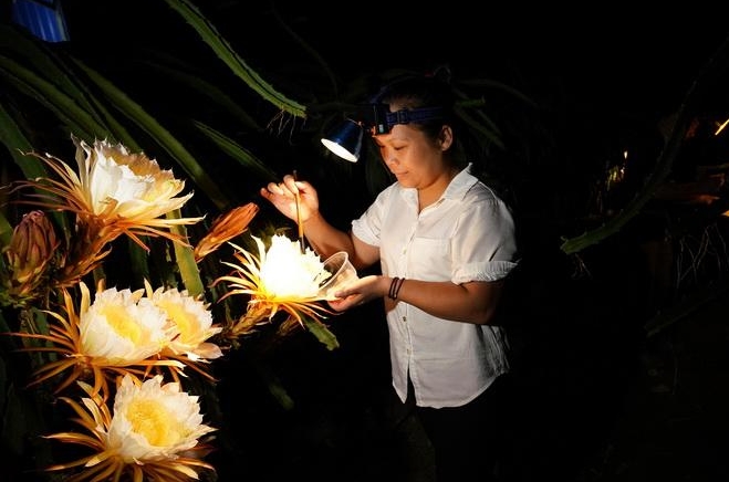 廣西融水:火龍果果農(nóng)夏夜“點(diǎn)花”忙