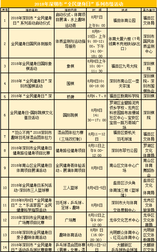 “今年市里將推出14項市級活動,各區(qū)也因地制宜推出了特色活動。”深圳市文體旅游局群體處處長謝汝成說道。