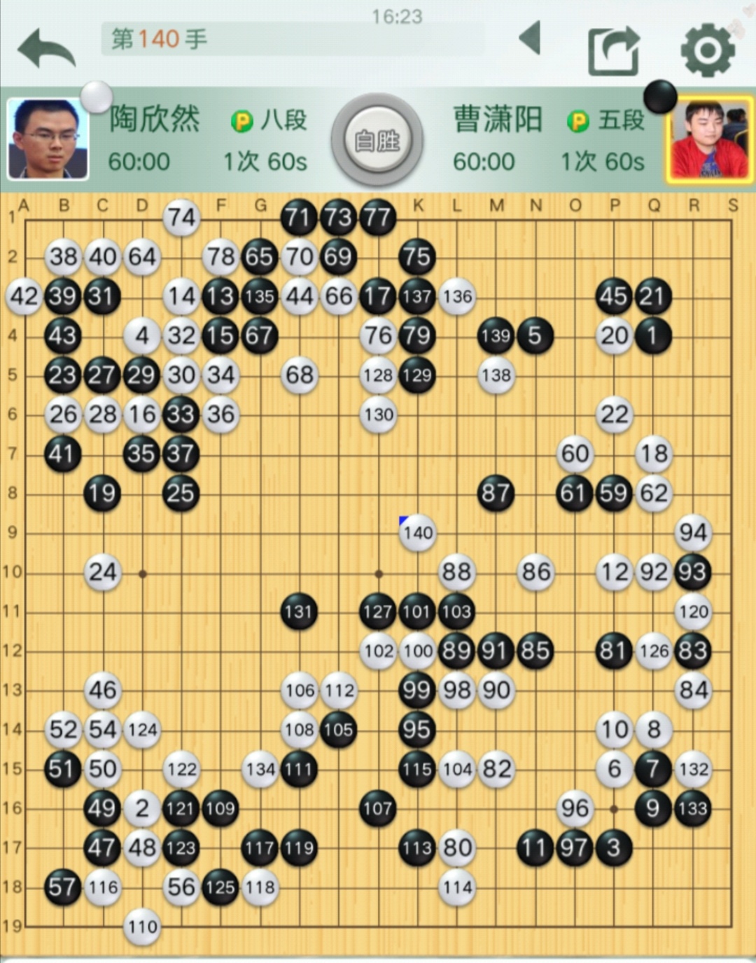 陶欣然自評(píng):布局階段至44的轉(zhuǎn)換差不多。黑63動(dòng)出至79收獲不大,白方確立優(yōu)勢。白116吃住左下角后領(lǐng)先不少了。