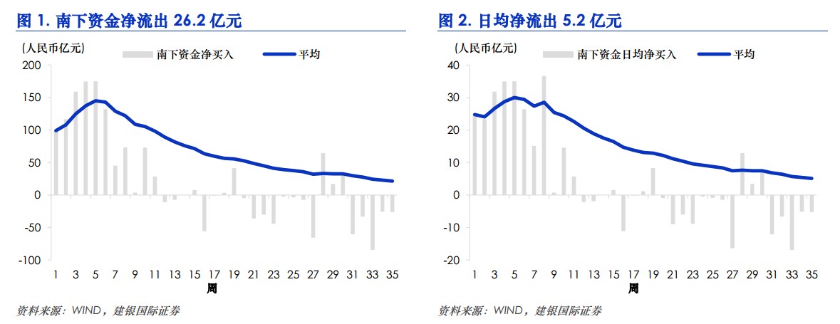 南下資金連續(xù)5周維持凈流出狀態(tài),凈流出量26.2 億元,環(huán)比增加 0.5 億元。買入賣出均維持低量,顯示南下資金情緒仍然較為謹慎。而上周人民幣兌港元反彈0.3%,不利于資金南下復蘇。
