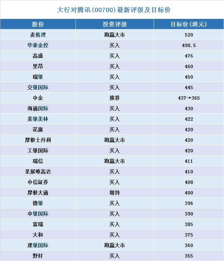 經(jīng)智通財(cái)經(jīng)APP整理的騰訊(00700)最新投資評(píng)級(jí)及目標(biāo)價(jià)如下: