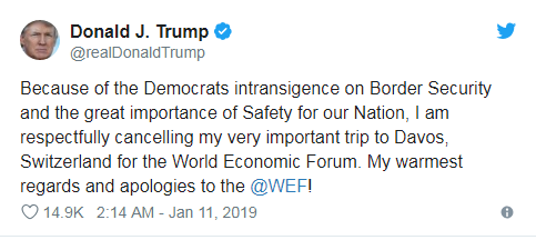 特朗普表示,由于民主黨在邊境安全問題上的頑固態(tài)度和國家安全的重要性,他謹慎地取消前往瑞士達沃斯參加世界經(jīng)濟論壇的行程,并向世界經(jīng)濟論壇致以問候和歉意。另外,美國政府高級官員表示,即使本月晚些時候政府仍處于關閉狀態(tài),美國財政部長姆努欽將帶領美國政府代表團出席達沃斯論壇。
