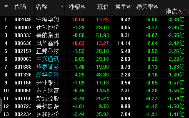 資金凈流出靠前: