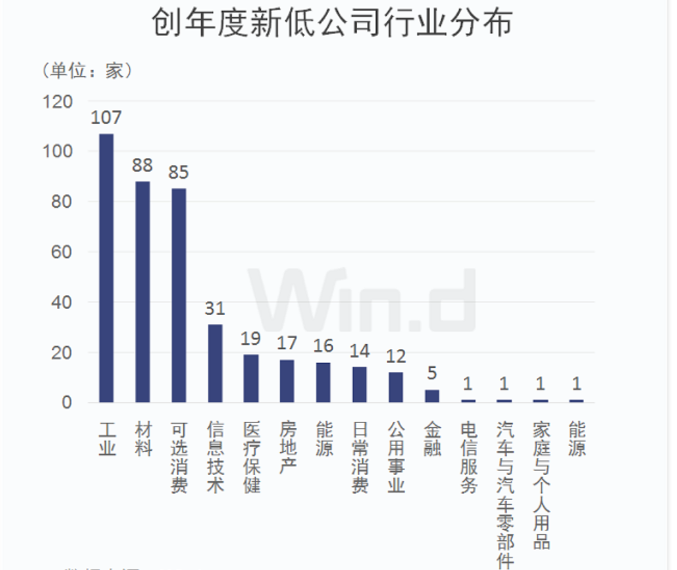 Wind統(tǒng)計(jì)顯示,有395家公司近3日最低股價(jià)創(chuàng)今年以來(lái)新低。從相關(guān)公司行業(yè)分布來(lái)看,工業(yè)最多,有107家,材料和可選消費(fèi)均有超過(guò)80家??梢?,雖然股指整體上漲,但傳統(tǒng)工業(yè)、材料領(lǐng)域投資者普遍不太看好。