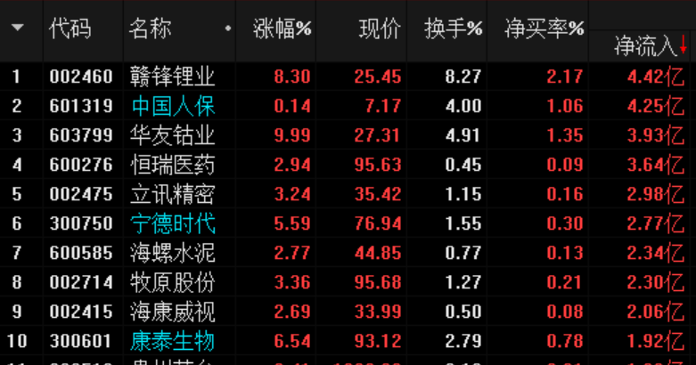 周二資金凈流入前10的公司: