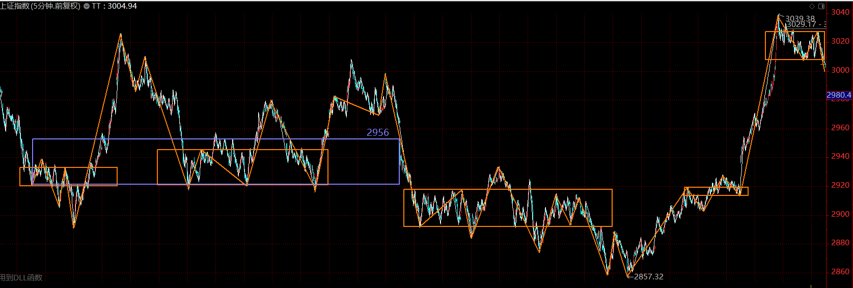 目前分析只需集中于這個五分鐘的上漲趨勢即可,上周如期做出了五分鐘上漲趨勢第二個中樞的雛形。前面幾天表現(xiàn)其實(shí)蠻超預(yù)期的,特別是科技股的逼空,A股似乎許久未見了。核心問題出在周五,周五有兩個點(diǎn)顯示出當(dāng)下市場的外強(qiáng)中干,第一個在于周五早盤南京證券反包漲停時,市場資金的失衡,明顯看出科技股與券商股兩臺“抽水機(jī)”從前幾天的互相配合變成了互相傷害;這一段跳水直接將圖形破壞,強(qiáng)度大的新高背馳可以說已經(jīng)沒有了,那下午上拉無力后的跳水也就在情理之中。