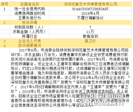 2017年8月,市消委會(huì)陸續(xù)收到深圳花皇藝術(shù)傳媒管理有限公司投訴7宗,涉及金額11萬(wàn)余元,消費(fèi)者集中反映該企業(yè)收受消費(fèi)者預(yù)付款后關(guān)閉分店或者無(wú)法按照約定繼續(xù)履行服務(wù)。2017年8月,市消委會(huì)組織現(xiàn)場(chǎng)調(diào)解會(huì),該企業(yè)法人王建軍在調(diào)解會(huì)現(xiàn)場(chǎng)與三位消費(fèi)者達(dá)成調(diào)解協(xié)議,約定12月份前分期退還預(yù)付款。達(dá)成調(diào)解協(xié)議后王建軍以經(jīng)營(yíng)不善等理由推諉、拖欠和拒絕退款,期間市消委會(huì)工作人員多次督促該企業(yè)及時(shí)履行調(diào)解協(xié)議退款未果。該公司于2016年4月15日將企業(yè)名稱(chēng) “深圳花皇文化傳播有限公司”變更為“深圳花皇藝術(shù)傳媒管理有限公司”; 2017年9月5日調(diào)解期間將法定代表人由“王建軍”變更為“章衛(wèi)珍”。2018年1月,市消委會(huì)向該企業(yè)發(fā)送了信用推送告知函,無(wú)人簽收,目前該企業(yè)已被市場(chǎng)監(jiān)管委列入經(jīng)營(yíng)異常名錄。依據(jù)《深圳市消費(fèi)者委員會(huì)消費(fèi)維權(quán)信用信息管理辦法(試行)》第九條,市消委會(huì)將該企業(yè)信息推送至深圳市公共信用中心等征信機(jī)構(gòu)。該企業(yè)雖然變更了公司名稱(chēng)和法定代表人等公司信息,但仍需承擔(dān)原企業(yè)未履行的法定或約定義務(wù)。