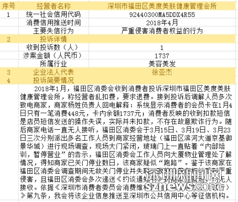 2018年1月,福田區(qū)消委會(huì)收到消費(fèi)者投訴深圳市福田區(qū)美度美膚健康管理會(huì)所,稱(chēng)經(jīng)營(yíng)者亂扣費(fèi),要求退回余額(會(huì)員卡余額1737元)。接到投訴后調(diào)解人員多次致電商家,商家楊姓負(fù)責(zé)人回電解釋?zhuān)合到y(tǒng)顯示消費(fèi)者的會(huì)員卡在1月4日只有一筆消費(fèi)448元,卡內(nèi)余額1737元;消費(fèi)者反映的收到扣款短信是店員短信發(fā)送的操作失誤,實(shí)際并未扣款,不存在故意欺詐行為。隨后商家電話(huà)一直無(wú)人接聽(tīng),福田區(qū)消委會(huì)于3月15日、3月19日、3月23日三次分別派出多名工作人員到商家經(jīng)營(yíng)地址(福田區(qū)濱河大道京基御景華城)進(jìn)行現(xiàn)場(chǎng)調(diào)查,現(xiàn)場(chǎng)大門(mén)緊閉,玻璃門(mén)上一直貼著“內(nèi)部培訓(xùn),暫停營(yíng)業(yè)”的告示,福田區(qū)消委會(huì)工作人員向大廈物業(yè)管理處了解情況,得知商家已關(guān)門(mén)停業(yè)數(shù)日,該商家疑似“跑路”。鑒于該商家在福田區(qū)消委會(huì)調(diào)查期間無(wú)故關(guān)門(mén)停業(yè)并失聯(lián),致使消費(fèi)者權(quán)益受到嚴(yán)重侵害,且福田區(qū)消委會(huì)多次遞送《約談通知書(shū)》到商家經(jīng)營(yíng)地,均無(wú)人接收。依據(jù)《深圳市消費(fèi)者委員會(huì)消費(fèi)維權(quán)信用信息管理辦法(試行)》第九條,我會(huì)將該企業(yè)信息推送至深圳市公共信用中心等征信機(jī)構(gòu)。