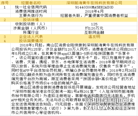 2018年1月起,南山區(qū)消委會(huì)陸續(xù)接到深圳前海黃牛在線(xiàn)科技有限公司投訴共125宗,涉及金額約120萬(wàn)人民幣。消費(fèi)者反映該公司自2017年5月成立以來(lái),在其黃牛拼app以面值3-5折價(jià)格拼團(tuán)售賣(mài)“樂(lè)享卡”,該公司宣稱(chēng)通過(guò)黃牛拼app購(gòu)買(mǎi)“享樂(lè)卡”后,可以用該卡充值油卡、話(huà)費(fèi)、天貓、攜程、京東、水電煤等生活消費(fèi)。最初消費(fèi)者購(gòu)買(mǎi)的“樂(lè)享卡”可正常用于生活消費(fèi)端充值,直至2018年春節(jié)期間該公司以放假、系統(tǒng)升級(jí)等理由停止生活消費(fèi)端充值,僅售賣(mài)“樂(lè)享卡”,同時(shí)在APP平臺(tái)添加會(huì)員機(jī)制,哄騙眾多會(huì)員繳納年費(fèi)。2018年2月26日該公司以融資失敗為由關(guān)閉所有生活消費(fèi)端充值業(yè)務(wù),同時(shí)將生活消費(fèi)端充值平臺(tái)改為商城,限定消費(fèi)者采用“拼團(tuán)余額+高價(jià)現(xiàn)金”的方式購(gòu)買(mǎi)價(jià)格高于市場(chǎng)價(jià)4-5倍的商城產(chǎn)品。