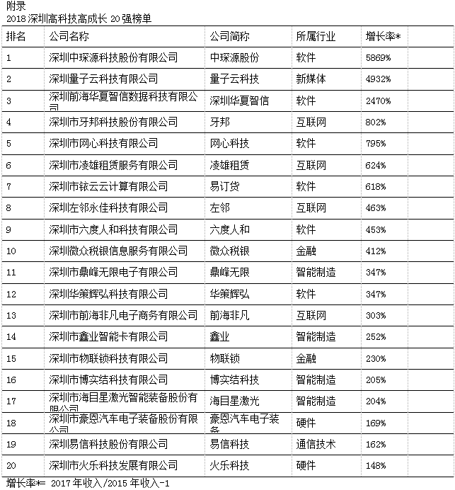 今年,榮登“深圳20強(qiáng)”三甲的獲獎(jiǎng)企業(yè)分別為深圳中琛源科技股份有限公司、深圳量子云科技有限公司和深圳前海華夏智信數(shù)據(jù)科技有限公司,他們?cè)谶^去三年中表現(xiàn)出的平均增長率分別為5,869%、4,932%和2,470%。本年度入選“深圳20強(qiáng)”的企業(yè)除了軟件、硬件、互聯(lián)網(wǎng)和通訊技術(shù)外,也不乏其他新興領(lǐng)域,如新媒體、智能制造和金融科技。此外,為表彰深圳市當(dāng)?shù)乇憩F(xiàn)優(yōu)秀且極具潛力的初創(chuàng)企業(yè),今年共有20家企業(yè)獲選“深圳明日之星”,它們來自多個(gè)不同的領(lǐng)域,包括人工智能、智能設(shè)備、電子商務(wù)、教育、生物醫(yī)藥、金融科技和互聯(lián)網(wǎng)平臺(tái)服務(wù)等 (詳見附錄)。獲選成為“深圳20強(qiáng)”和“深圳明日之星”的企業(yè),將自動(dòng)成為“中國高科技高成長50強(qiáng)”(簡稱“中國50強(qiáng)”)和“中國明日之星”的候選企業(yè),并在今年11月與全國其他入圍企業(yè)角逐,躋身全國增長最快、最具發(fā)展?jié)摿Φ母呖萍计髽I(yè)之列。