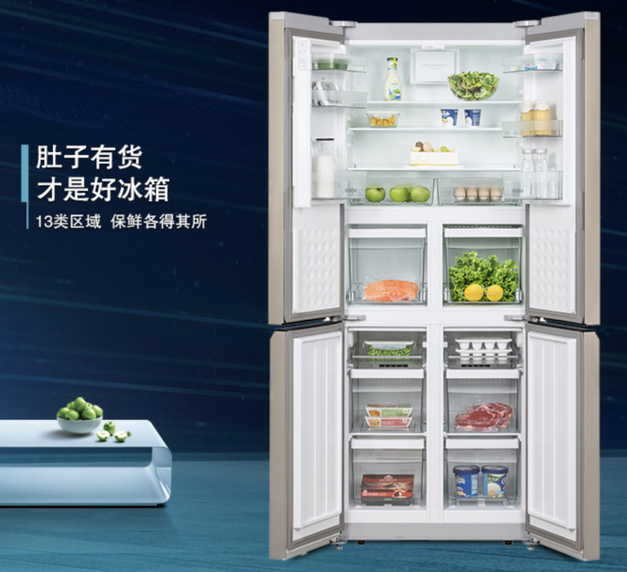西門子KM46FA30TI采用十字對開門設(shè)計(jì),不僅簡約美觀,容積更是達(dá)到了452升,13類區(qū)域設(shè)置,讓每份食物都各得其所,滿足了家庭更多的儲存需求。混冷雙動力、風(fēng)冷無霜、零度保鮮,可以讓蔬菜水果保持新鮮水嫩,也可以讓魚、肉營養(yǎng)不流失,鮮嫩如常。LCD顯示+觸摸控制,嵌入式門把手,閉門系統(tǒng),它不妥協(xié)任何細(xì)節(jié),盡顯人們生活品味。
