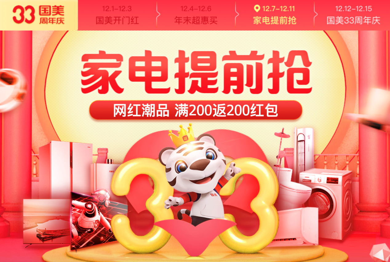 12月12日-14日,國(guó)美33周年“超級(jí)夜市”,線上商城、線下門店共赴一場(chǎng)“巔峰2小時(shí)”的盛宴。家裝、換新、添置新物件,所有的需求在國(guó)美一次滿足。